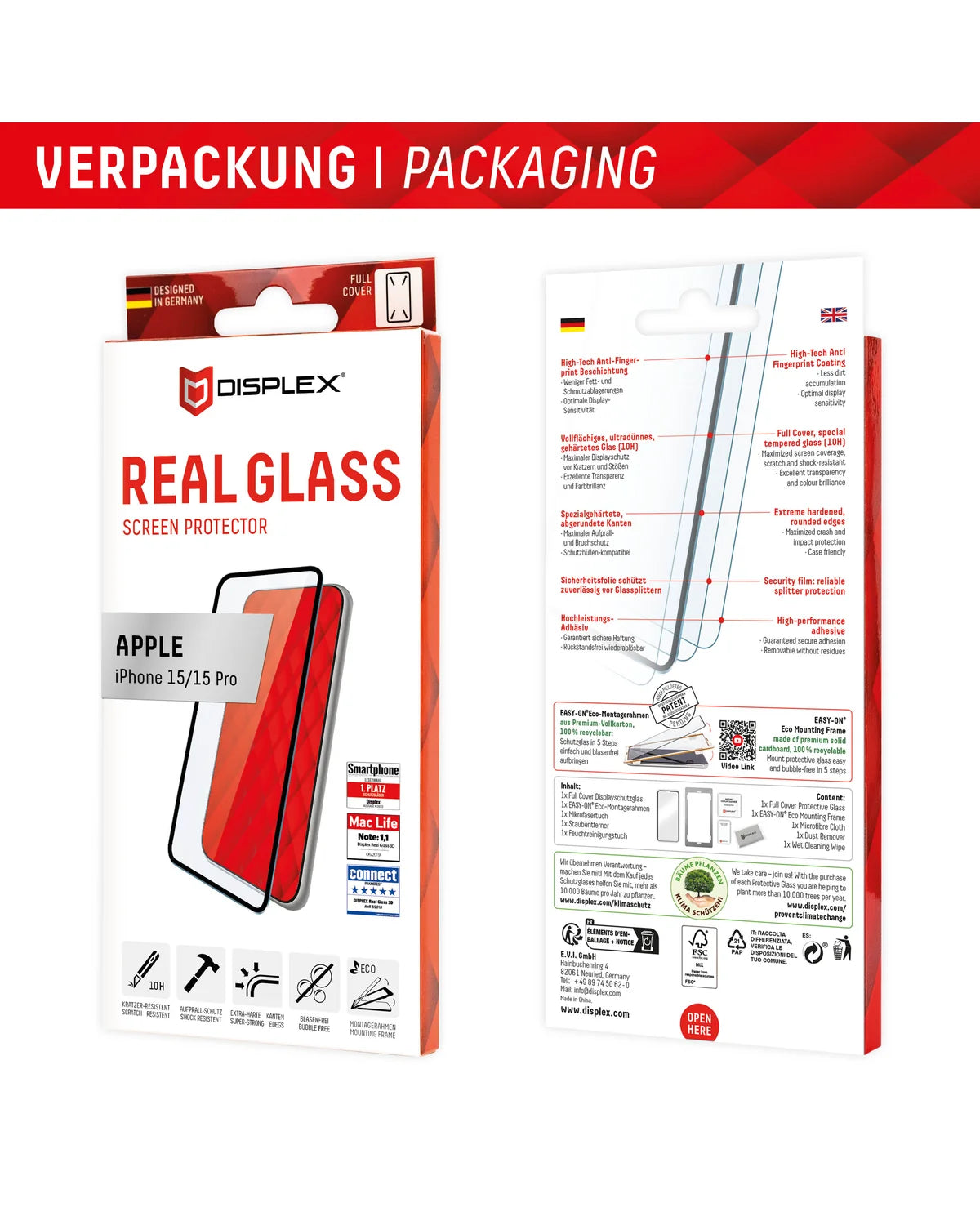 Met de Displex Real Glass Full Cover screenprotector krijgt je Apple iPhone 15 / 15 Pro maximale bescherming. Ultradun 0,3 mm glas met 10H hardheid en volledige dekking.