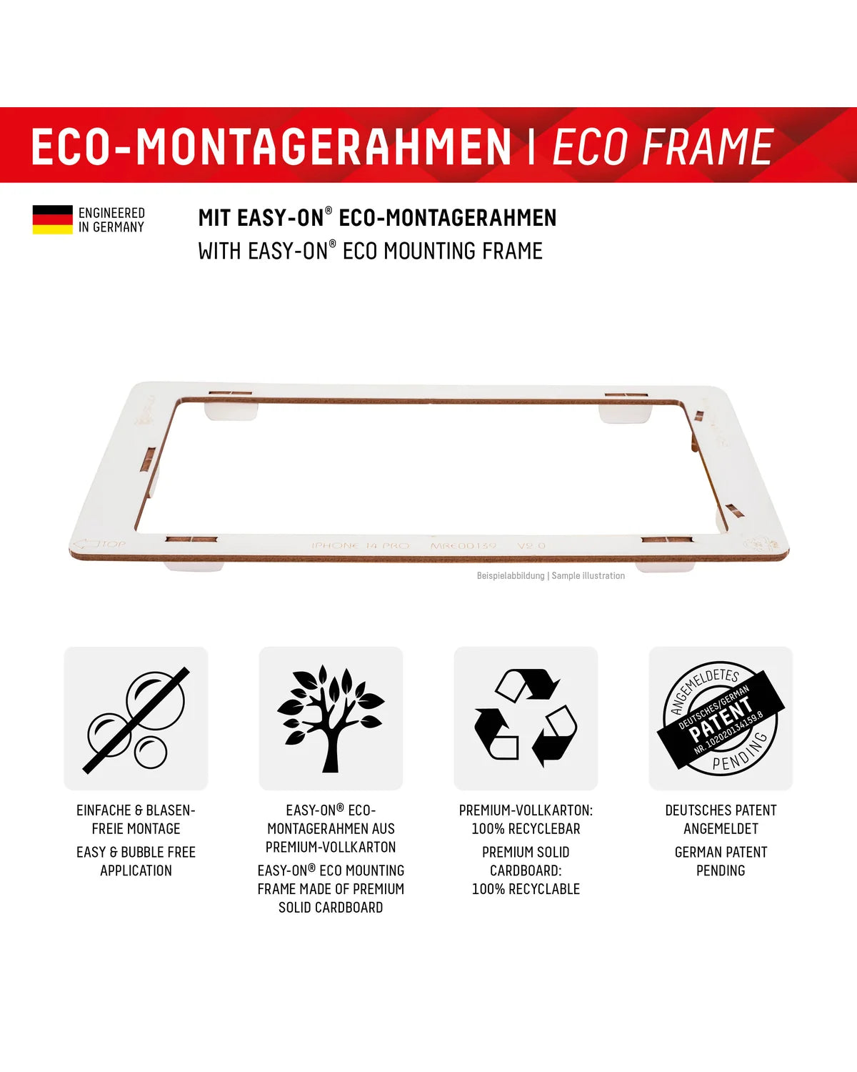Deze premium screenprotector bedekt niet alleen het actieve deel van je scherm, maar het volledige display – inclusief afgeronde randen. Het 10H geharde glas is harder dan saffier en voorkomt krassen, stoten en breuken. Dankzij de plasma-coating blijven vingerafdrukken en vuil achterwege, terwijl het touchscreen net zo gevoelig blijft als altijd. Met het EASY-ON® Eco montageframe installeer je het glas snel, nauwkeurig en bubbelvrij.