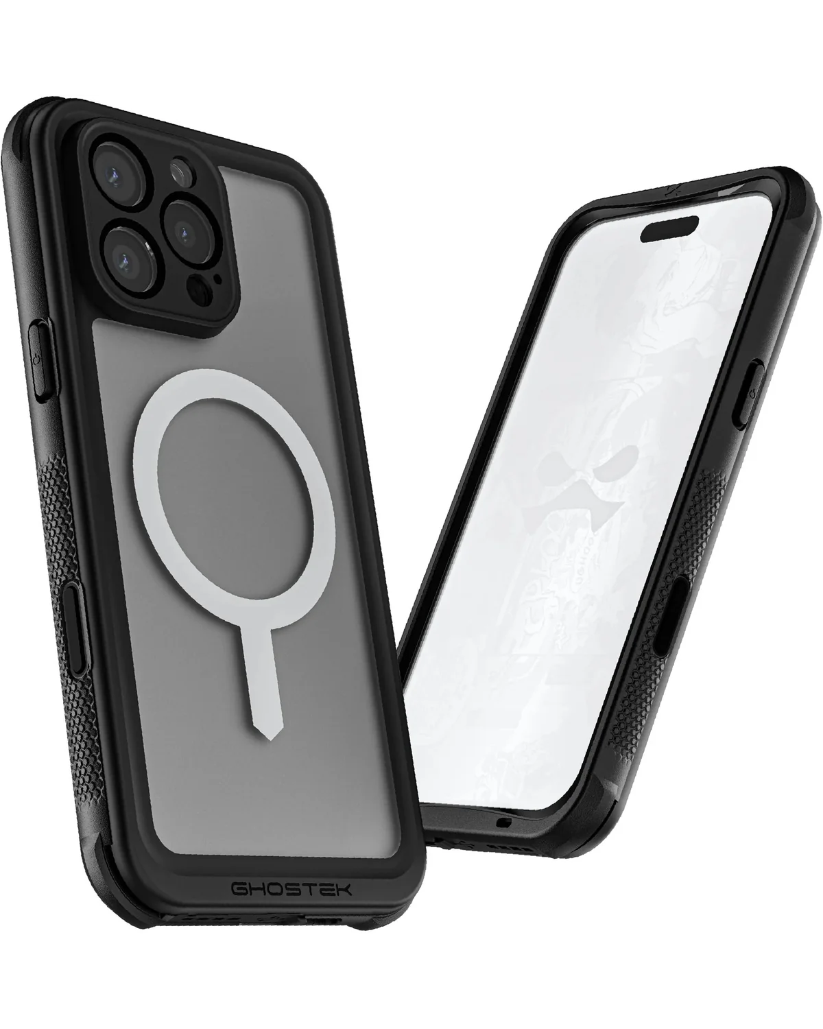De Ghostek Nautical Case voor iPhone 16 Pro Max is transparant, waterdicht tot 6 meter en valbestendig tot 3,5 meter. Inclusief een riemclip, schokbestendig ontwerp en compatibel met MagSafe en draadloos opladen.