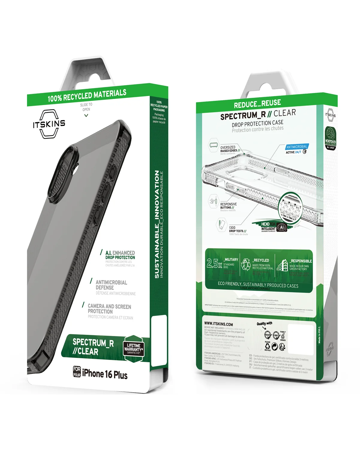 Het SpectrumClear_R hoesje van ITSKINS voor iPhone 16 Plus in zwart transparant combineert krachtige bescherming met een lichtgewicht design. Flexibel TPU zorgt voor grip en compatibiliteit met draadloos opladen.