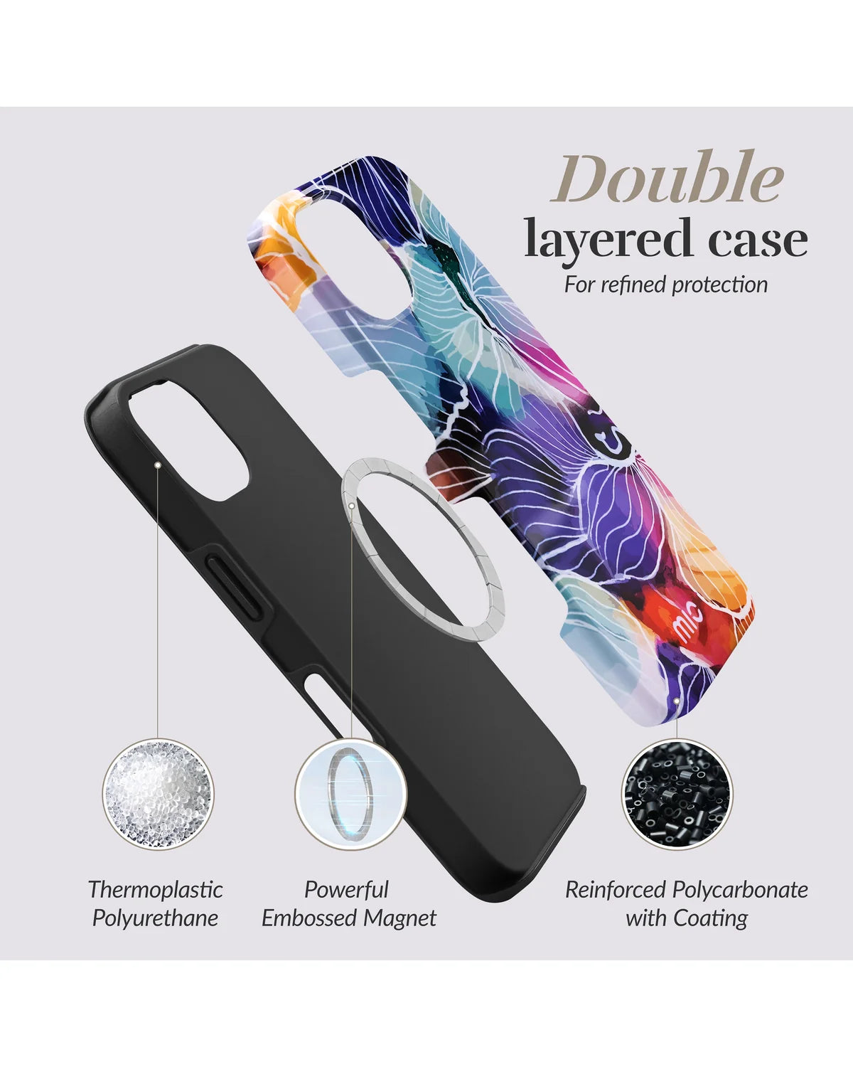 Dit smartphone hoesje biedt een perfecte mix van creativiteit en bescherming. De hybride constructie dempt schokken effectief, en dankzij de MagSafe-functionaliteit klik je moeiteloos accessoires vast en laad je direct op. Het slanke profiel, de prettige grip en de verhoogde randen zorgen voor extra gebruikscomfort en veiligheid tijdens dagelijks gebruik.