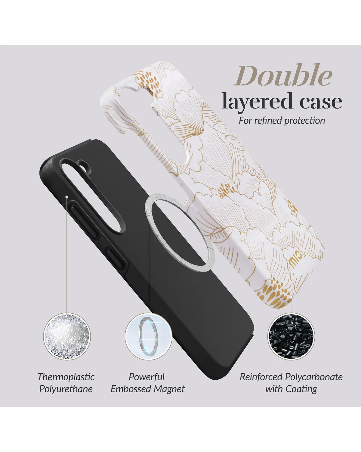 Het Mio by Mobilize White Roses MagSafe Compatibel Hoesje geeft jouw Samsung Galaxy S25 Fe 5G een elegante en romantische uitstraling dankzij het verfijnde bloemenpatroon in zachte goudtinten.