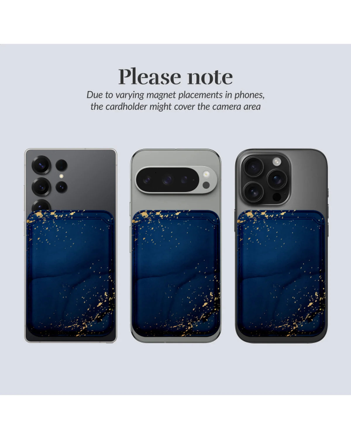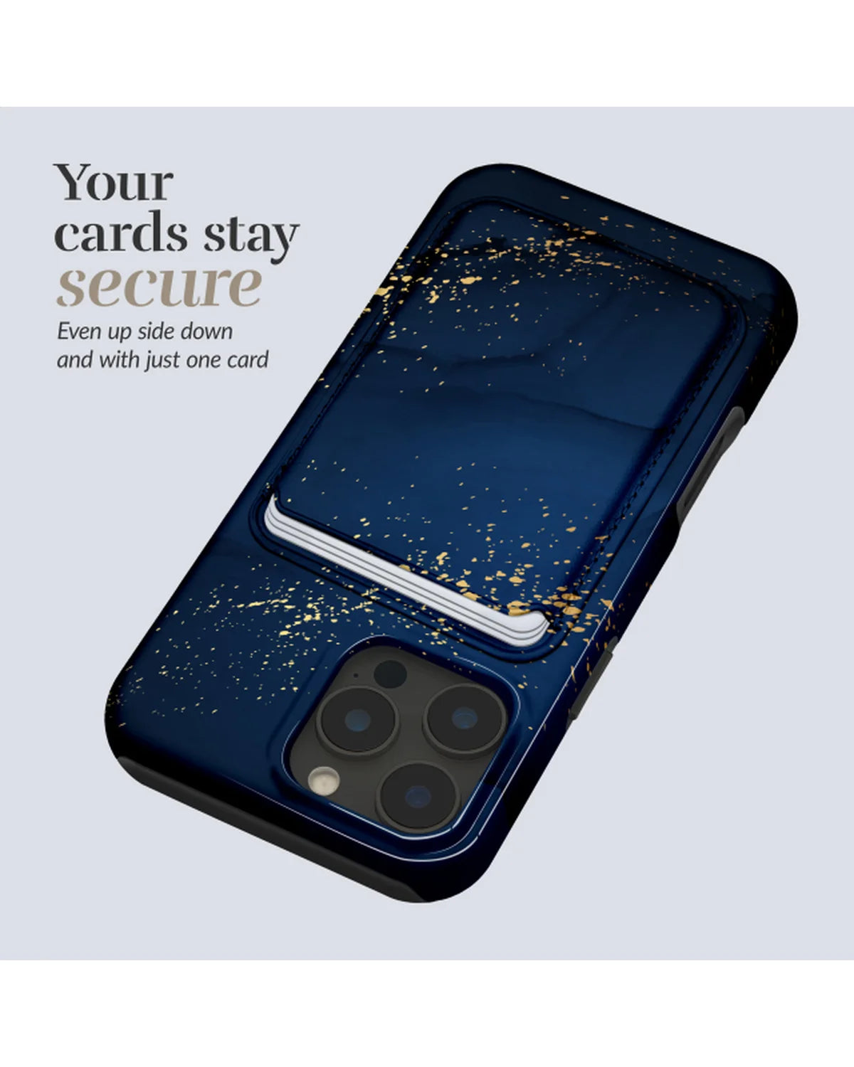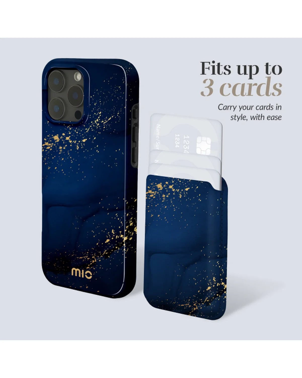 Dankzij de krachtige MagSafe-magneten blijft de MIO Card Holder stevig op zijn plek – ideaal voor onderweg. De houder biedt ruimte aan drie pasjes, zoals je ID, bankkaart of OV-kaart. Het diepe nachtblauw met gouden spetters geeft je telefoon een luxe, feestelijke uitstraling die opvalt zonder te overdrijven.
