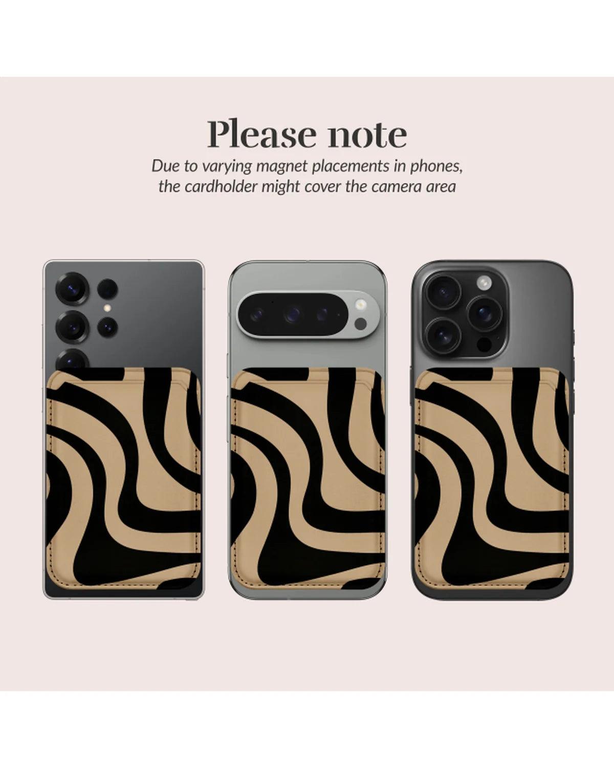 De kaarthouder klik je stevig vast op je MagSafe-compatibele telefoon of hoesje dankzij de krachtige magneten. Je belangrijkste pasjes – zoals je ID, OV-kaart of betaalpas – zitten veilig opgeborgen in het stevige PU-leer. De opvallende swirlprint in zand en zwart geeft dit accessoire een moderne, speelse uitstraling.