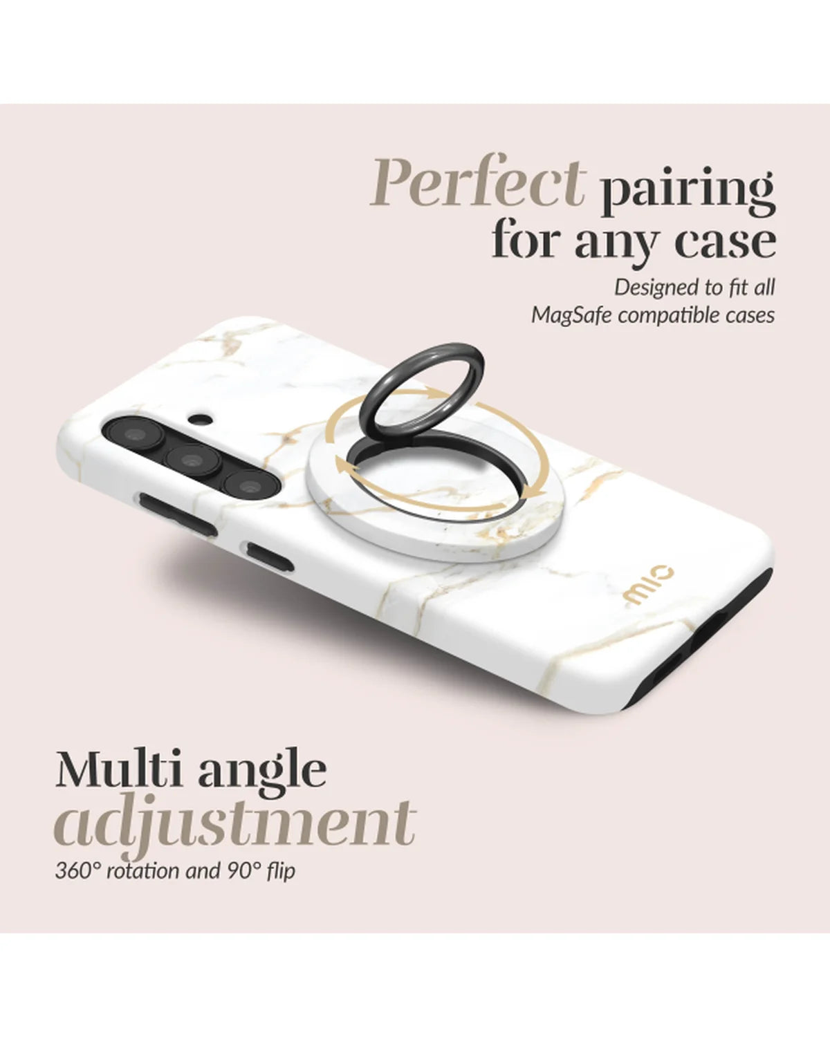 De MIO White Marble Ring Holder biedt niet alleen extra houvast, maar tilt ook je telefoonstijl naar een hoger niveau. De sterke MagSafe-magneten zorgen voor een stabiele bevestiging, terwijl je met de 360° draaibare en 90° kantelbare ring moeiteloos overschakelt naar handsfree gebruik. Het witte marmerpatroon met subtiele goudbruine aders zorgt voor een minimalistische en chique uitstraling.