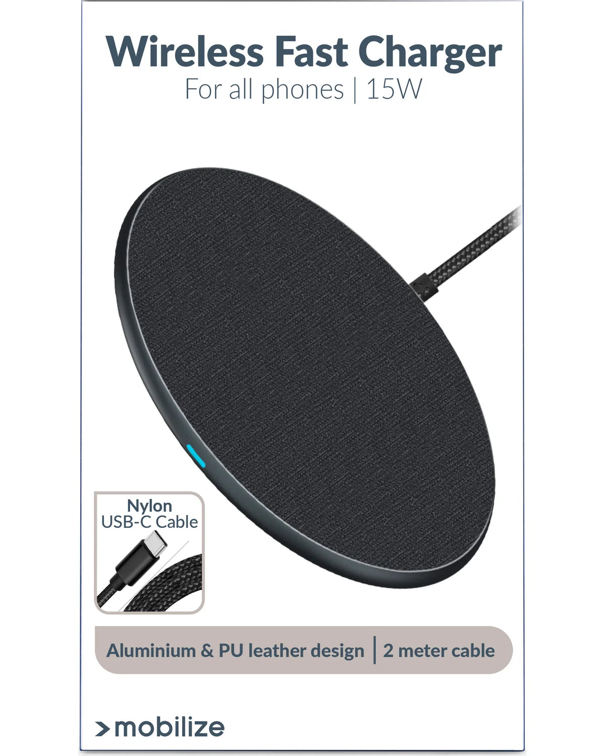 Deze stijlvolle draadloze Qi-snellader van Mobilize combineert luxe PU leer met een ultradun design en ondersteunt tot 15W snel opladen – ideaal voor iPhone, Samsung en andere Qi-toestellen.