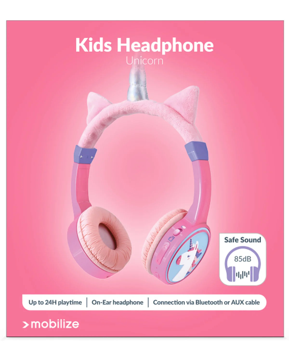 Laat kinderen veilig en stijlvol luisteren met deze draadloze unicorn koptelefoon van Mobilize. Tot 24 uur batterij, Bluetooth 5.3, 85 dB volume limiter en AUX – ideaal voor thuis, school of onderweg.