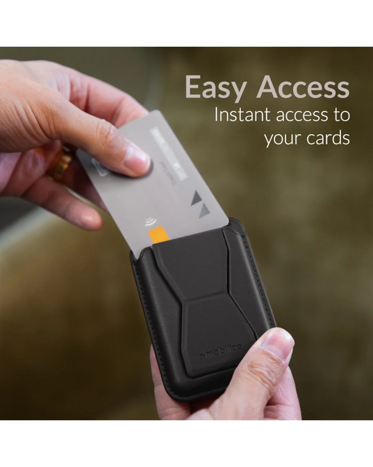 Deze zwarte magnetische kaarthouder van Mobilize is de perfecte mix van functionaliteit en minimalistisch design. Draag je belangrijkste pasjes veilig én stijlvol, direct bevestigd op je MagSafe-compatibele telefoon of hoesje.