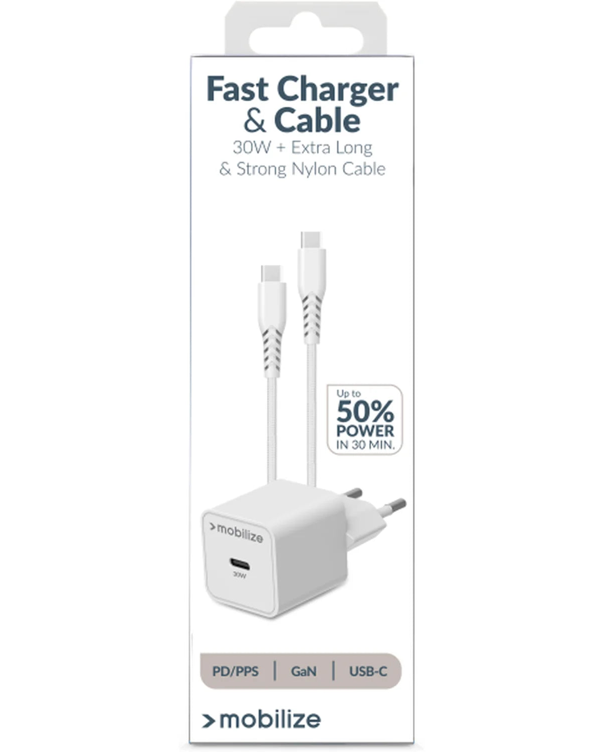 Witte 30W USB-C snellader van Mobilize met GaN-technologie en meegeleverde nylon USB-C kabel (1.2m). Ondersteunt PD en PPS voor razendsnel, veilig en efficiënt opladen.