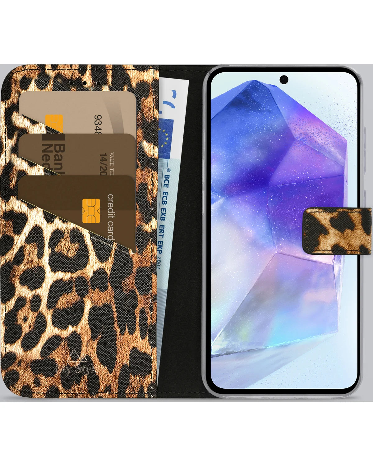 Bestel nu en geef jouw Samsung Galaxy A55 5G een modieuze en karaktervolle upgrade met deze opvallende leopard wallet case!