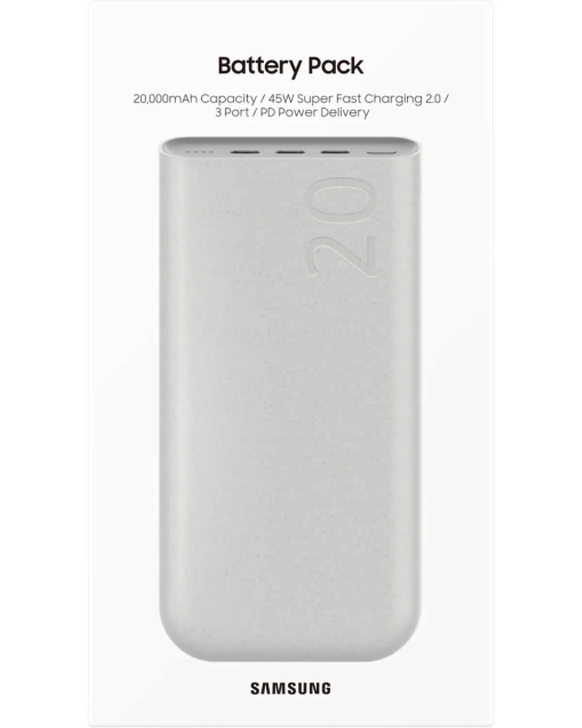 Krachtig onderweg met de Samsung Battery Pack 20000mAh – 45W – Beige. Supersnel laden via 3 poorten met PD, PPS en Quick Charge.