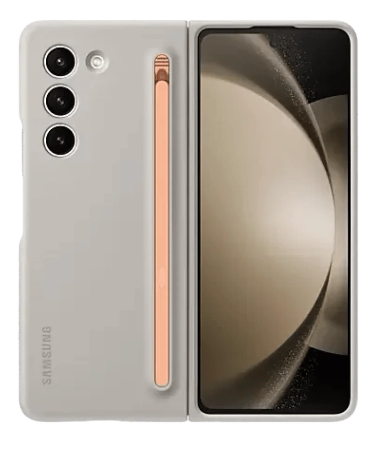 De Samsung Slim S Pen Case in de kleur Zand is een strak vormgegeven beschermhoesje voor de Galaxy Z Fold 5 met geïntegreerde houder voor de meegeleverde Slim S Pen.