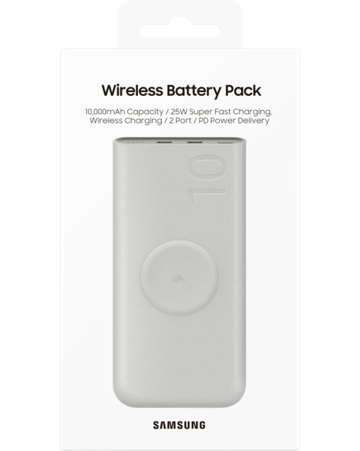 Onderweg altijd energie met de Samsung Wireless Battery Pack 10000mAh – 25W – Beige. Draadloos laden, 2 USB-C poorten en milieuvriendelijk design.